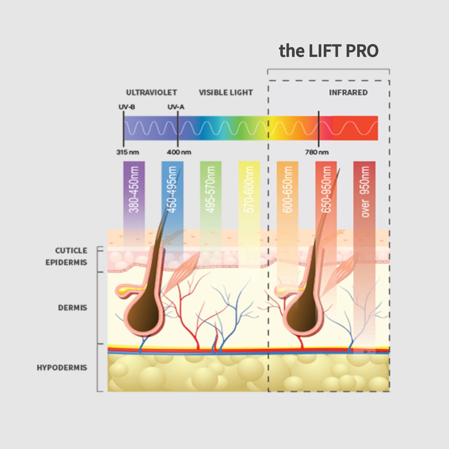 The LIFT PRO utilise une plage de longueurs d’onde située entre 650 et 950 nm, considérée comme idéale pour atteindre le derme et l’hypoderme — les zones où se régénèrent naturellement le collagène et l’élastine, essentiels à la fermeté et à la jeunesse de la peau.
