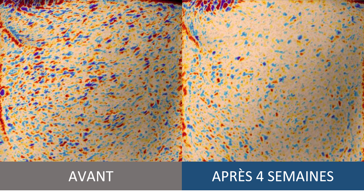Une amélioration de la tension du derme, une hydratation complète, une peau raffermie et un grain de peau resserré.